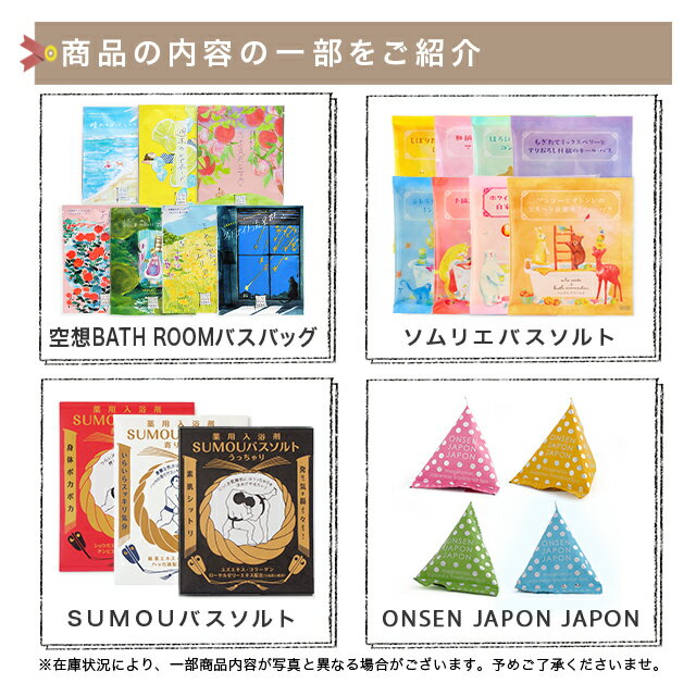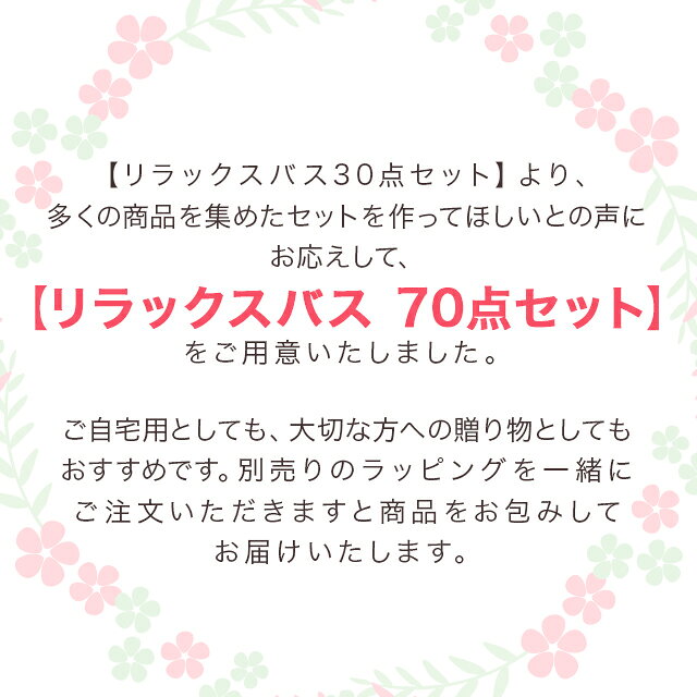 ※ギフト対応についてご一読ください 売れ筋商品のひとつ【リラックスバス30個セット】より、もっと多くの商品を集めたセットを作ってほしいとの声にお応えして、【リラックスバス 70点セット】ができました! 日常使いの入浴剤としてはもちろん、大切な方へのプレゼントにもおすすめです。
