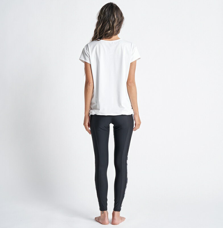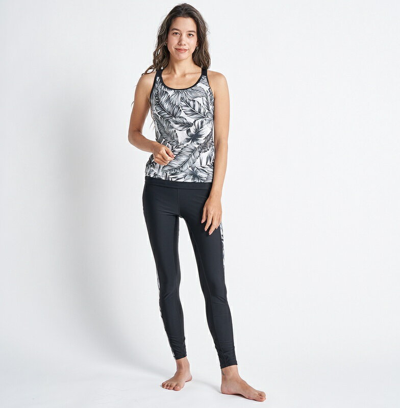 取り外し可能なパット付きのキャミソールにフル丈のレギンス、Tシャツの3点セットのスイムウエア。