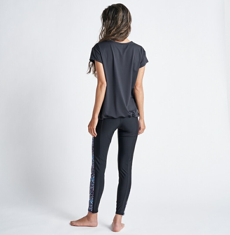 レギンスは無地ベースのサイドに柄のラインで切り替えを施しすっきりとした印象に。