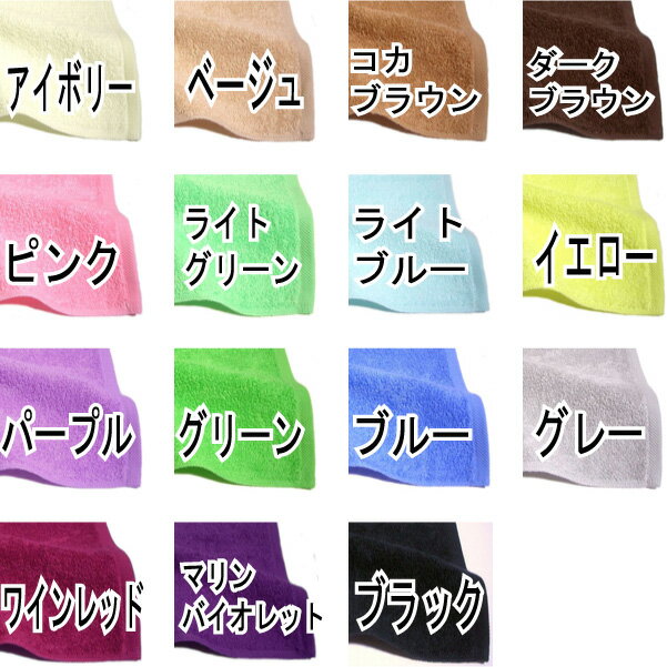 しかも、後晒しする事によって糸に付いた不純物も 綺麗に落としてしまうのでとっても清潔ですョ! ずっと安心して使っていただけるそんなタオルです アイボリーベージュコカブラウンダークブラウン ピンクライトグリーンライトブルーイエロー パープルグリーンブルーグレイ ワインレッドマリンバイオレットブラック ●タオル製品の取り扱いについて ※タオル製品は吸水性が良く肌触りがソフトですが他の繊維製品と比較して織組織は甘いという特性を 持っておりますので下記洗濯方法をご留意頂き末長くご使用頂くための参考にして頂ければ幸いです。